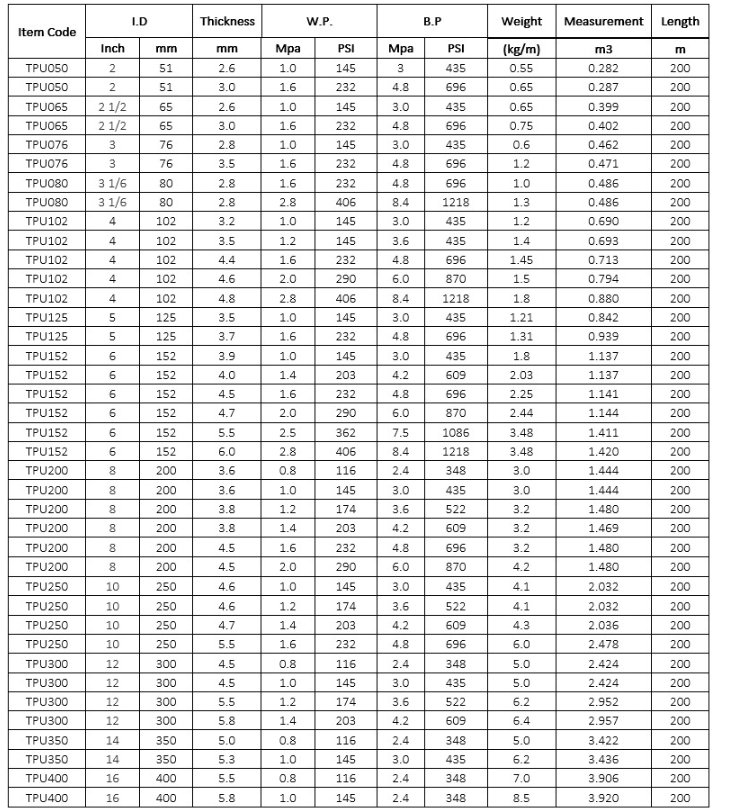 TPU Layflat Hose is made from extruded thermoplastic polyester based polyurethane (TPU) with excellent wear & tear properties. It’s reinforced with circular woven filament polyester yarn.